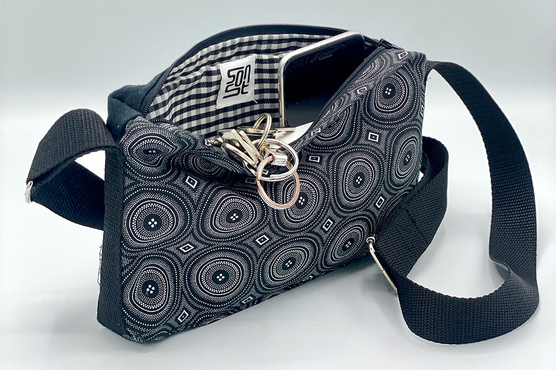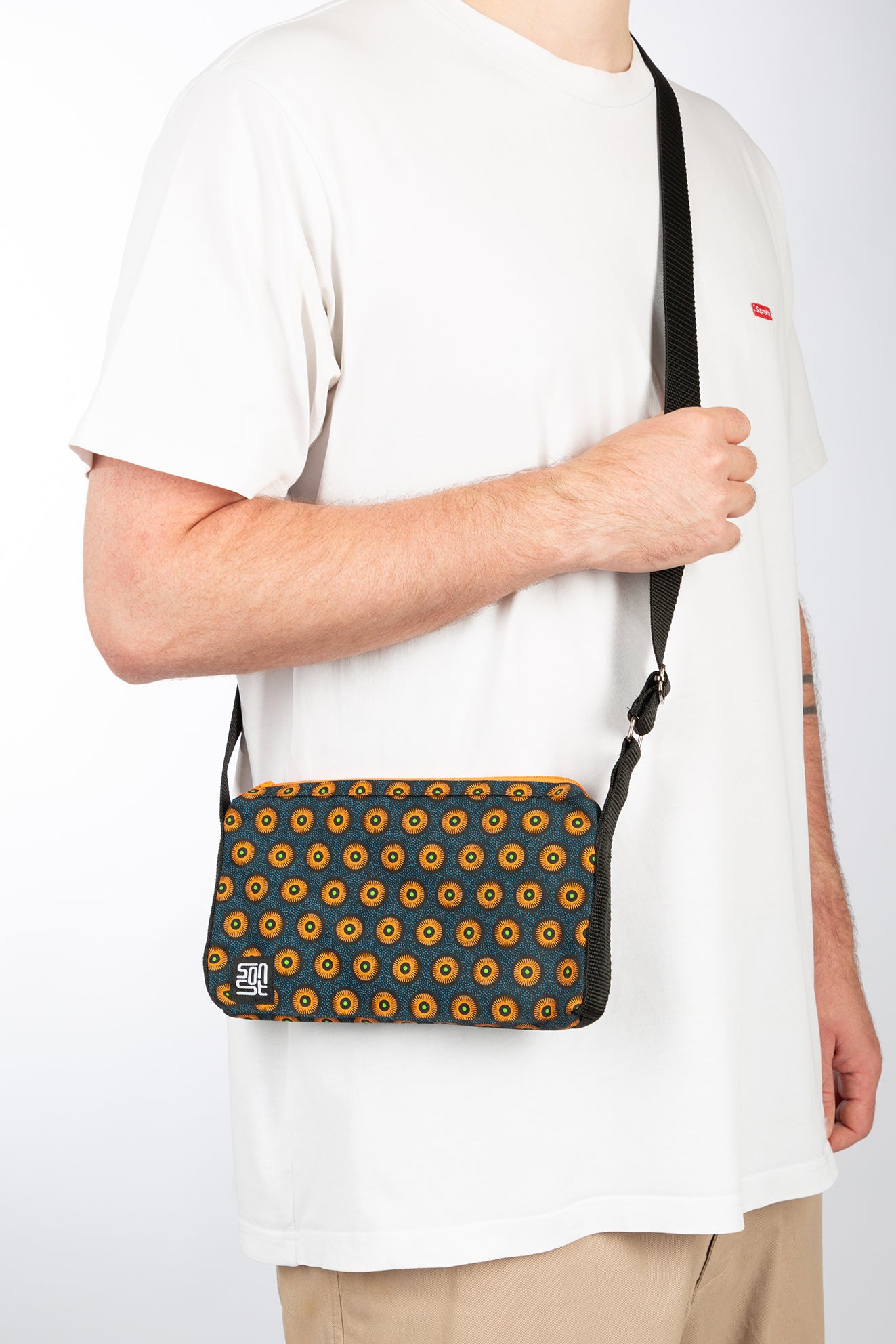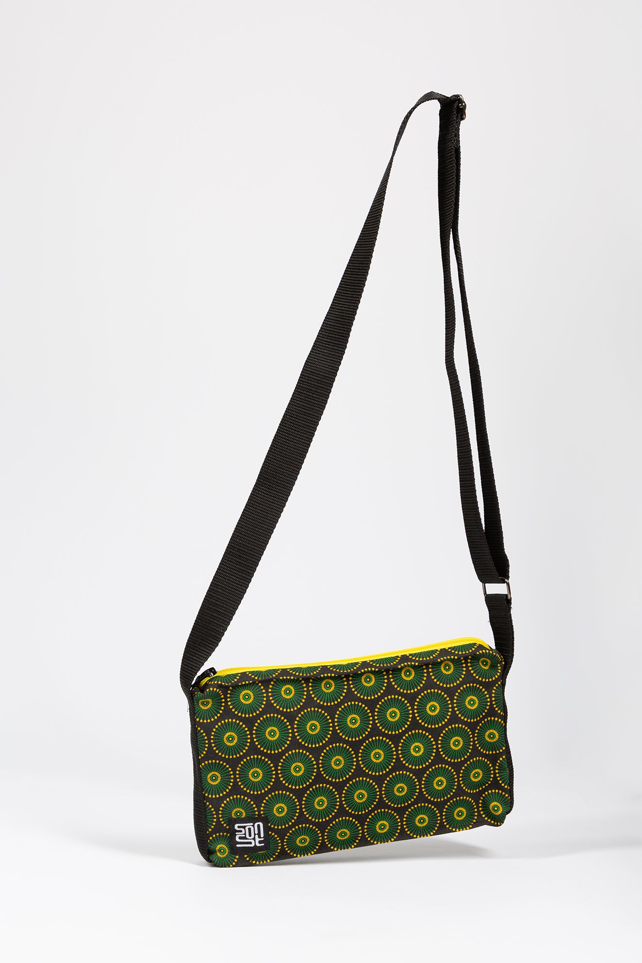 Die kompakte unisex Umhängetasche aus strapazierfähigem Baumwollstoff mit Waxprint. Mit verstellbarem Gurt und praktischem Reißverschlussfach bietet sie Platz für Handy, Schlüssel, Geldbörse und mehr.